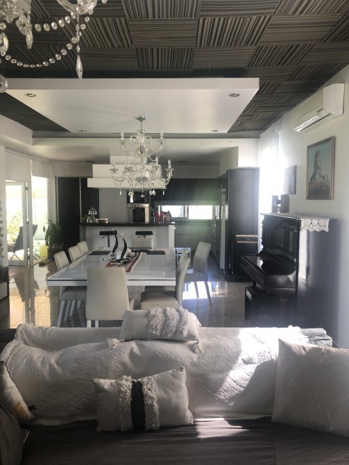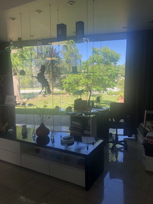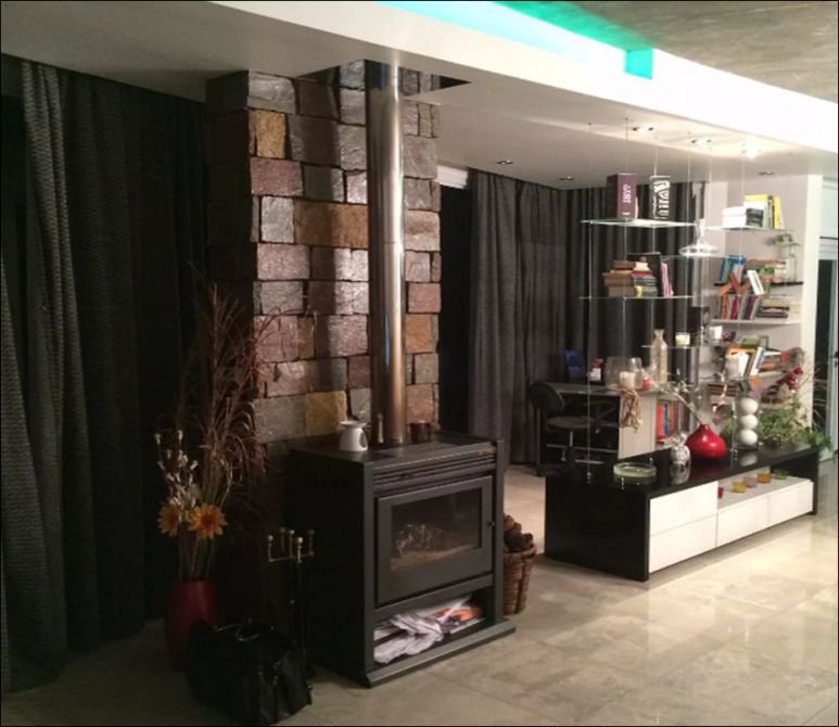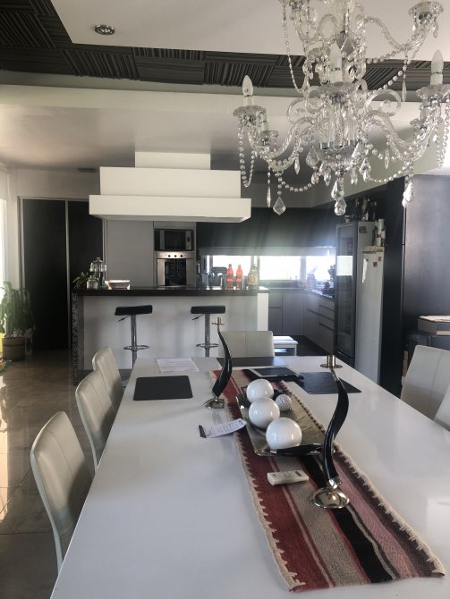 Amplio y luminoso living comedor con salamandra, cocina con isla desayunador y doble bacha, espacio para lavavajillas, muebles de alacena y bajomesada, espacio para dos heladeras, anafe eléctrico y cocina, horno eléctrico.