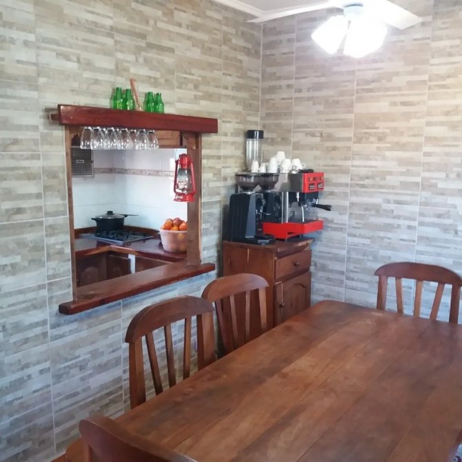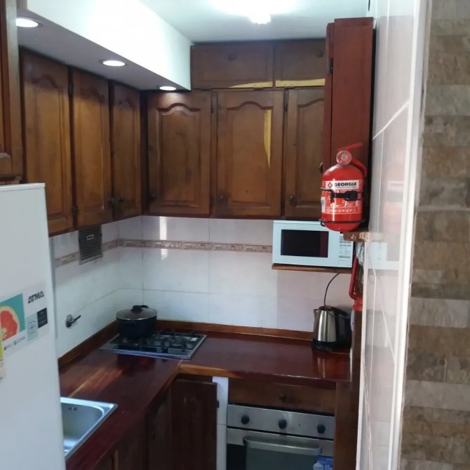 * Cocina con mesada, bajo mesada y alacenas en quebracho, con anafe industrial embutido y extractor en acero inox.