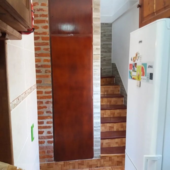 * Escalera revestida en madera de quebracho y ladrillo de vidrio.