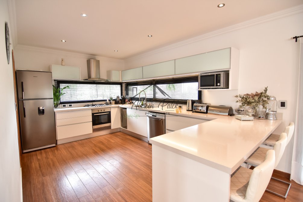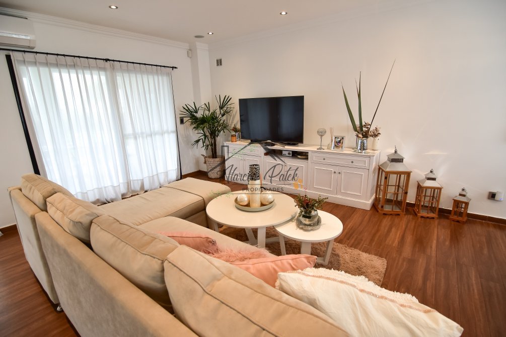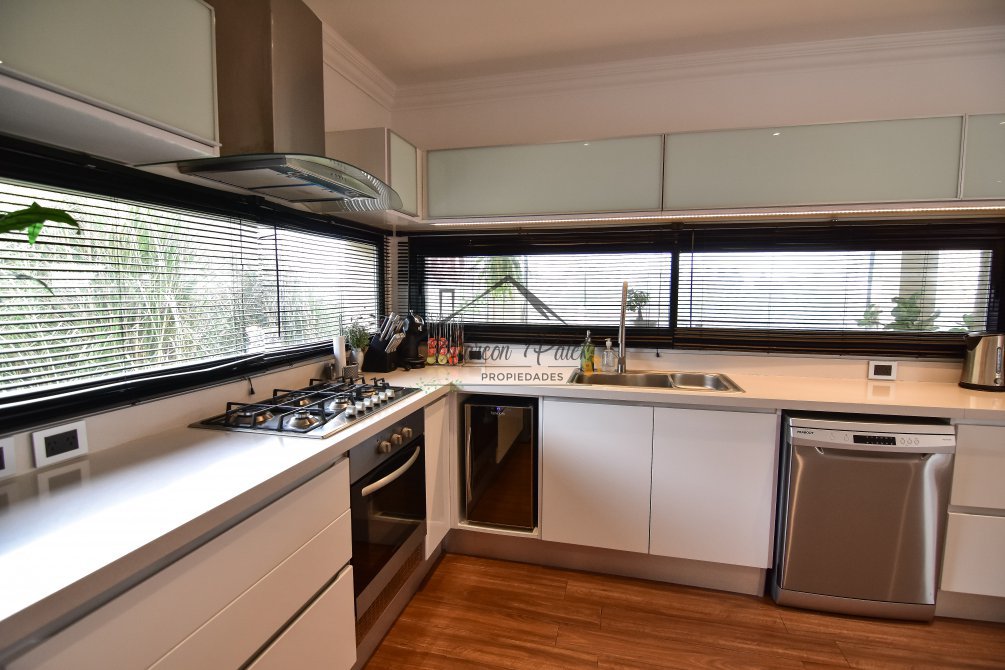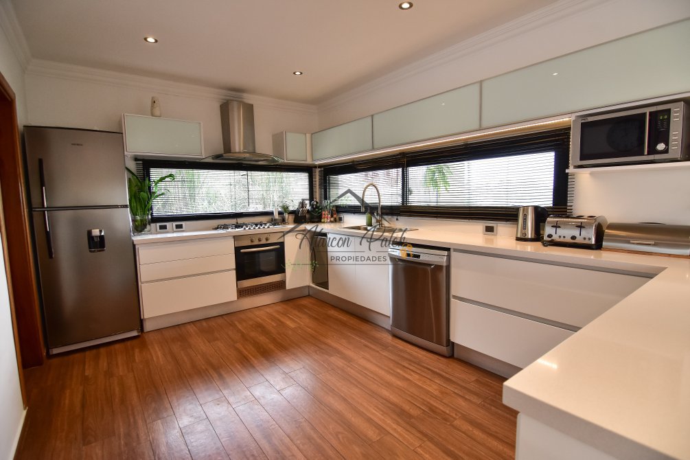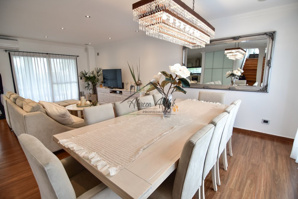 Hermosa propiedad en dos plantas sobre lote interno de 615 metros. En planta baja cuenta con amplio living comedor, cocina con muebles bajo mesada y alacenas (RENO) en garantia, isla con silestone en 4 cm, anafe ariston de 6 hornallas, horno electrico y lavavajillas. Toilette de recepcion. Lavadero independiente. Amplia galeria con toldos cristal, parrilla y horno de barro. Baño exterior con ducha. Espacio de guardado exterior. Hermoso parque, con grama bahiana, riego por aspersion automatizado, piscina de 9 x 4 totalmente revestida en venecitas con Jacuzzi de 2x 2 metros 8 jets, caldera, luces rgv, solarium de 10 x 2.5 metros. En planta alta (tres dormitorios), dos dormitorios con placard, suite con vestidor y baño completo con jacuzzi. Amplio balcon corrido. Iluminacion en parque. Iluminacion led dimerizable en toda la casa. Escalera revestida en madera. Aire acondicionado frio calor en todos los ambientes. Musica funcional en planta baja y galeria. Griferias FV. Aberturas DVH, modena negra. Detalles de categoria. Dos termotanques de alta recuperacion. Grupo electrogeno.