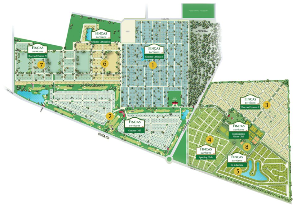 Fincas de San Vicente es un mega emprendimiento inmobiliario de 675 hectáreas, distribuidos en siete sectores: Chacras Urbanas I, Chacras Urbanas II, Golf, Spoting Club, Equitación, De la Laguna y Polo. Está localizado en la ciudad de San Vicente. Se encuentra a 20 minutos de la Av. general Paz y 50 minutos del centro, por Autopista Ricchieri, Av. Jorge Newbery, Ruta 52.