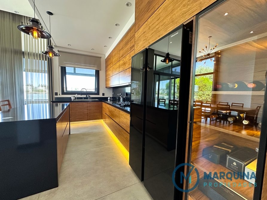 Cocina completamente equipada con isla y heladera doble puerta.
