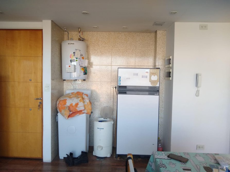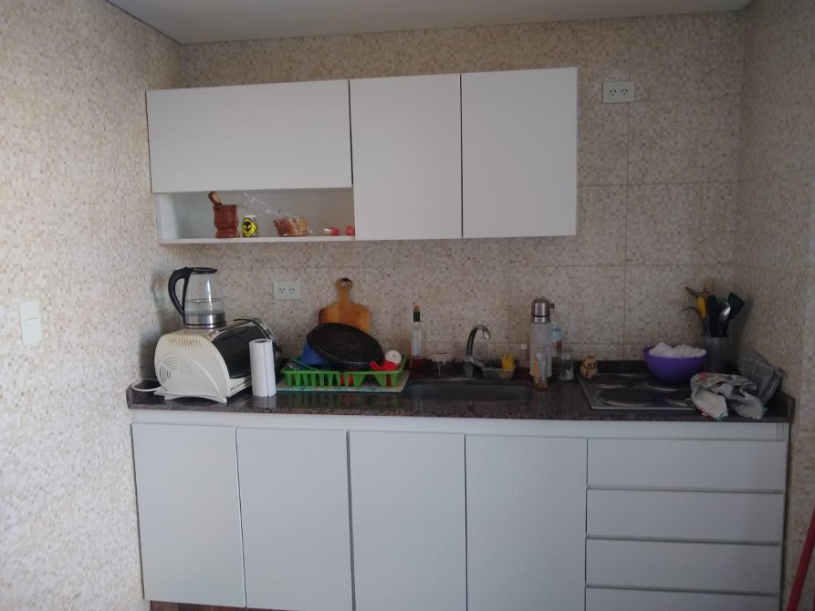 -Cocina con paredes revestidas de cerámica blanca. Posee muebles bajo y sobre mesada recubiertos de melamina blanca. Mesada de granito. La cocina cuenta con una ventana que da al balcón, dándole excelente luminosidad y ventilación. Cuenta con Aire Acondicionado.