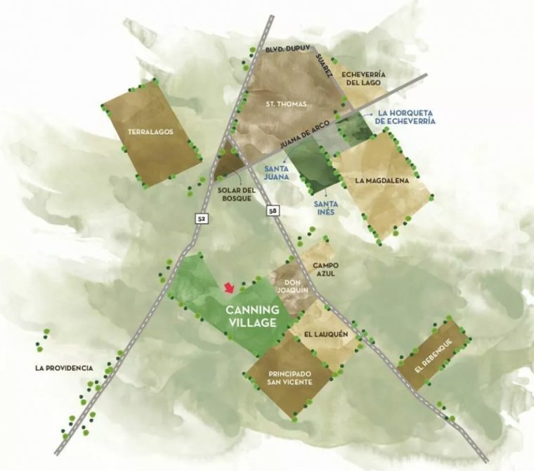 Canning Village con San Simón y San Felipe 100% suscritos es nuestro cuarto proyecto en Zona Sur, tras las suscripciones de La Horqueta de Echeverría, Santa Juana y Santa Inés. Se encuentra entre las rutas 58 y 52 y proyectamos desarrollar un boulevard de conectividad para ambas rutas. Será de acceso público y brindará un mejor acceso.