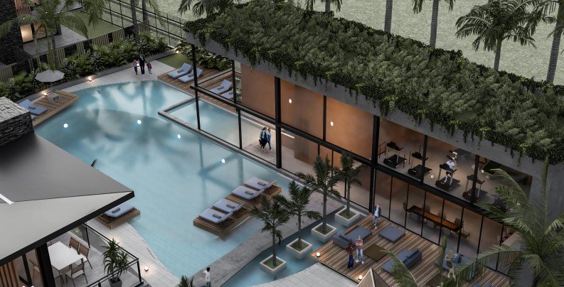 Sector de amenities, pileta y solarium, gimnasio, parrilla y SUM.